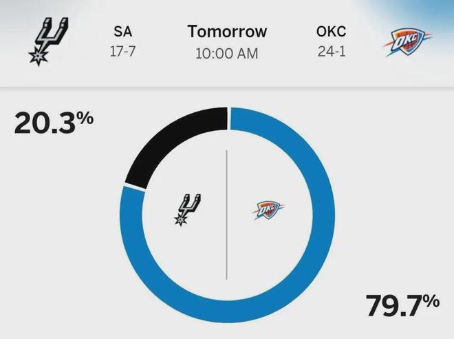 话说ESPN并不看好拥有文班亚马的马刺,可以战胜几乎不可击败的雷霆,两队胜率预测如下: