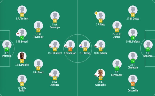 切尔西首发:1-桑切斯、3-库库雷利亚、23-查洛巴、27-古斯托、24-詹姆斯、29-福法纳、8-恩佐、10-帕尔默(58'20-若昂-佩德罗)、49-加纳乔(77'41-埃斯特旺)、7-内托、9-德拉普(32'38-吉乌)
